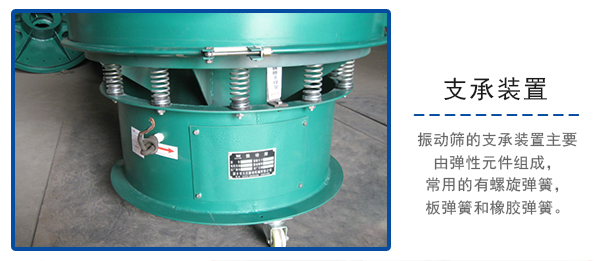 振動篩的支承裝置有吊式和座式兩種。座式安裝較為簡單,且安裝高度低,一般應優先選用。振動篩的支承裝置主要由彈性元件組成,常用的有螺旋彈簧、板彈簧和橡膠彈簧。