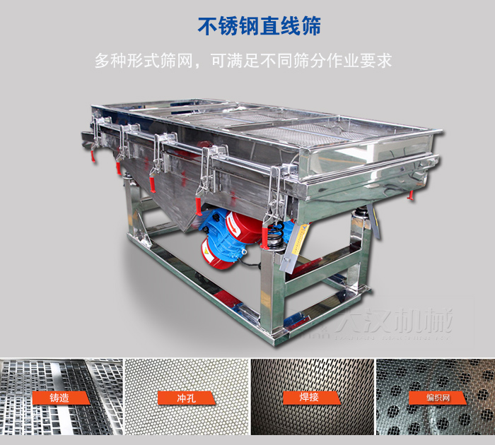 不銹鋼直線篩根據(jù)用戶現(xiàn)場要求可座式或吊式安裝,篩面有金屬編織網(wǎng)、鑄造、焊接、沖孔等多種形式,可滿足不同篩分作業(yè)要求。