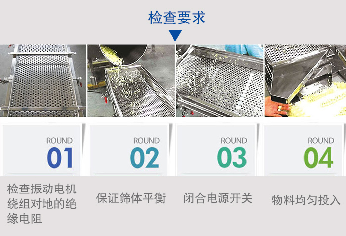 3、閉合電源開關(guān),確認(rèn)振動(dòng)電機(jī)同步反向旋轉(zhuǎn),進(jìn)行10-20分鐘空運(yùn)轉(zhuǎn),設(shè)備在運(yùn)行時(shí)如有異常聲音,應(yīng)迅速關(guān)機(jī)進(jìn)行檢查處理。設(shè)備運(yùn)轉(zhuǎn)正常后,可將少量需篩分的物料通過進(jìn)料口設(shè)入篩機(jī)內(nèi),確認(rèn)物料向出料口方向行進(jìn),然后逐漸增加到所需和所能承受的給料量。