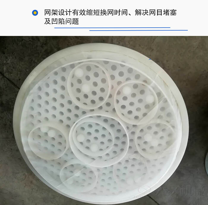 5、網(wǎng)架設(shè)計(jì)有效縮短換網(wǎng)時(shí)間、解決網(wǎng)目堵塞及凹陷問(wèn)題,清洗方便,操作簡(jiǎn)單;