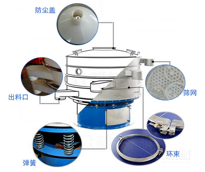 塑料振動(dòng)篩主要由進(jìn)料口、防塵蓋、出料口、束環(huán)、篩網(wǎng)、配重塊、上部重錘、振動(dòng)體、振動(dòng)電機(jī)、彈簧、下部重錘、機(jī)座等部分組成。