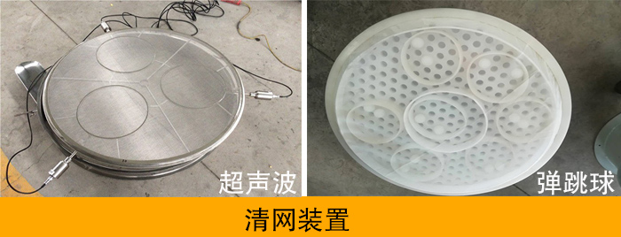 一般來(lái)說(shuō)清網(wǎng)裝置有:彈跳球和超聲波清網(wǎng)裝置。彈跳球采用硅膠材質(zhì),受到設(shè)備激振力的振動(dòng)擊打篩面來(lái)實(shí)現(xiàn)清網(wǎng)效果。超聲波清網(wǎng)裝置是一種高是通過(guò)高頻低振幅超聲波使篩面物料浮空從而實(shí)現(xiàn)清網(wǎng)效果。