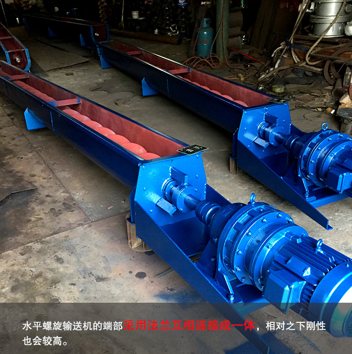 水平螺旋輸送機外殼采用無縫鋼管制作其密封性好,可以較少一些環(huán)境的污染,而水平螺旋輸送機的端部采用法蘭互相連接成一體,相對之下剛性也會較高。