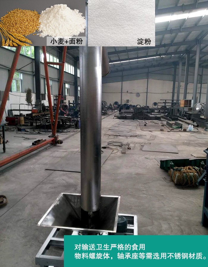 (1)對輸送衛生嚴格的食品行業,螺旋輸送機的機殼,螺旋體,軸承座等與物料觸摸的部件,需選用不銹鋼,銅等材質制成