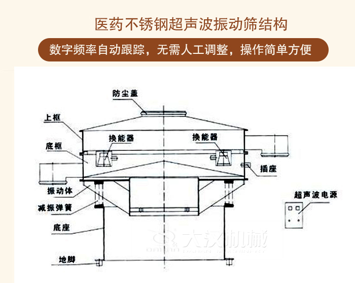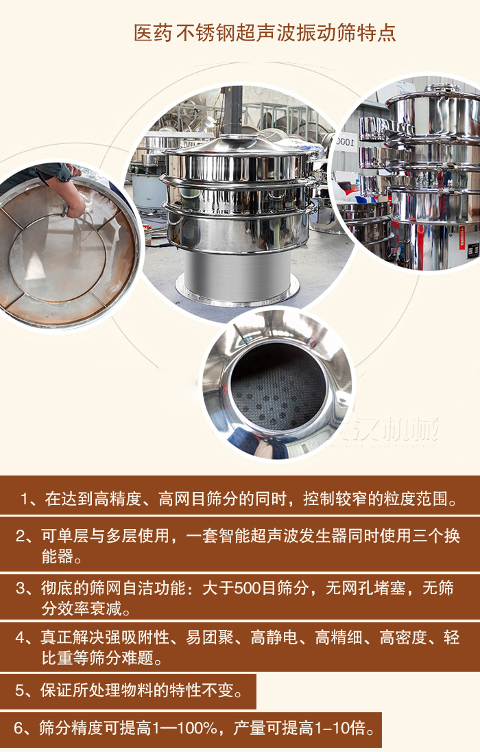 5、篩網: 適用于10目~635目。醫藥不銹鋼超聲波振動篩工作原理:超聲波篩分系統由超聲波諧振電源、振蕩器、共振環組成。