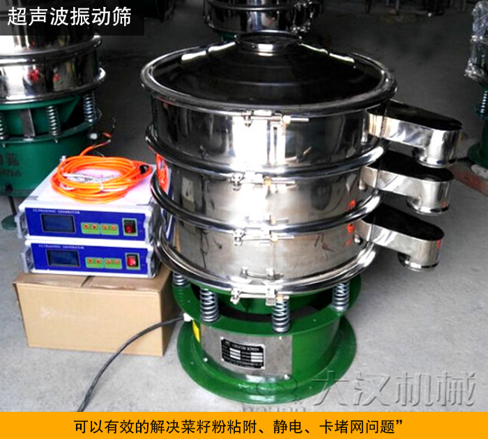 超聲波振動(dòng)篩是將220V,50Hz電能轉(zhuǎn)化為38KHz的高頻電能,輸入超聲波換能器,將其變?yōu)?8KHz機(jī)械振動(dòng),從而達(dá)到高效篩分和情網(wǎng)的目的,非常適合精微細(xì)粉篩分。菜籽粉是一種具有粘附效應(yīng),易產(chǎn)生靜電的物料,而超聲波振動(dòng)篩作為堵網(wǎng)克星,可以輕易的解決粘附、靜電、卡堵網(wǎng)問(wèn)題。