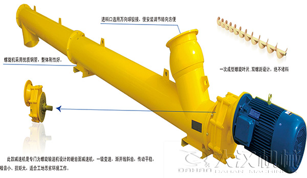 螺旋輸送機(jī)廣泛應(yīng)用于建材、化工、電力、冶金、煤炭、糧食等行業(yè)中水平或傾斜輸送粉狀、粒狀和小塊狀物料,如煤、灰、渣、水泥、糧食等,物料溫度小于200℃,不適于輸送易變質(zhì)的、粘性大以及易結(jié)塊的物料。
